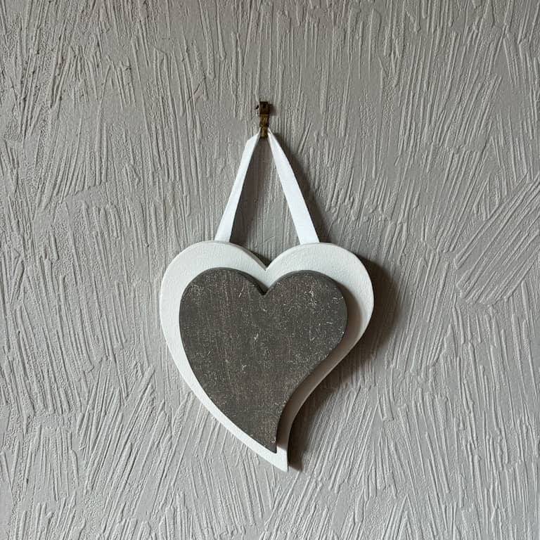 En ce qui concerne les coeurs décoratifs, ils ont été conçus par nos soins. Pour commencer, le bois à été poncé puis il à été coloré avec de la peinture de couleur grise et blanche. Pour finir, le coeur possède une accroche en corde afin de vous permettre une installation simple et rapide.