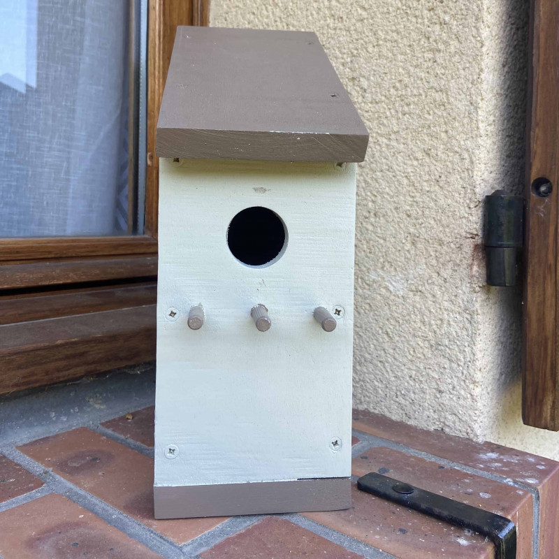 En ce qui concerne les nichoirs, ils ont été conçus par nos soins. Pour commencer, le bois à été poncé, puis peint avec des peintures acryliques. Pour finir, un verni incolore à été appliqué afin de les protéger.